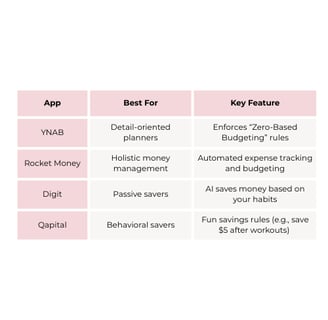 Qapital: Helps users automate savings through customizable rules, like rounding up purchases or setting aside money based on personal spending habits.